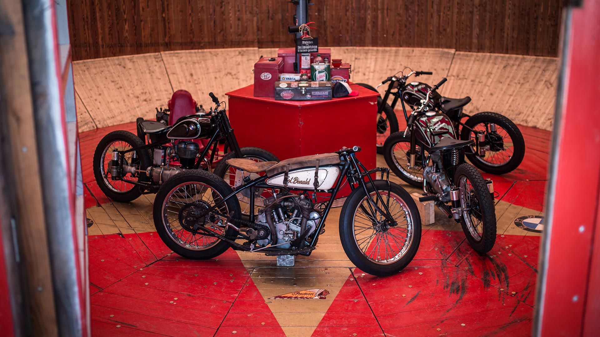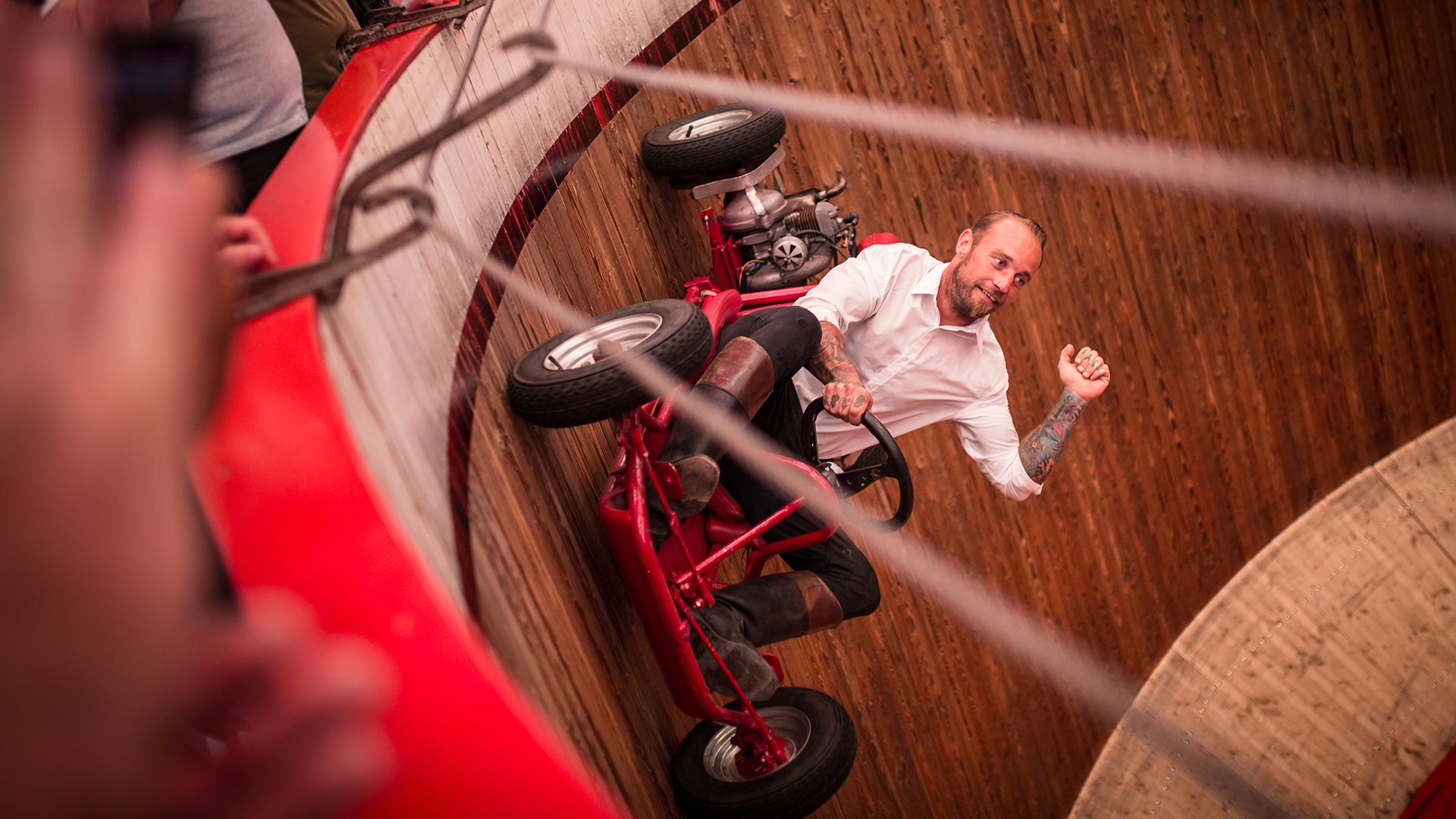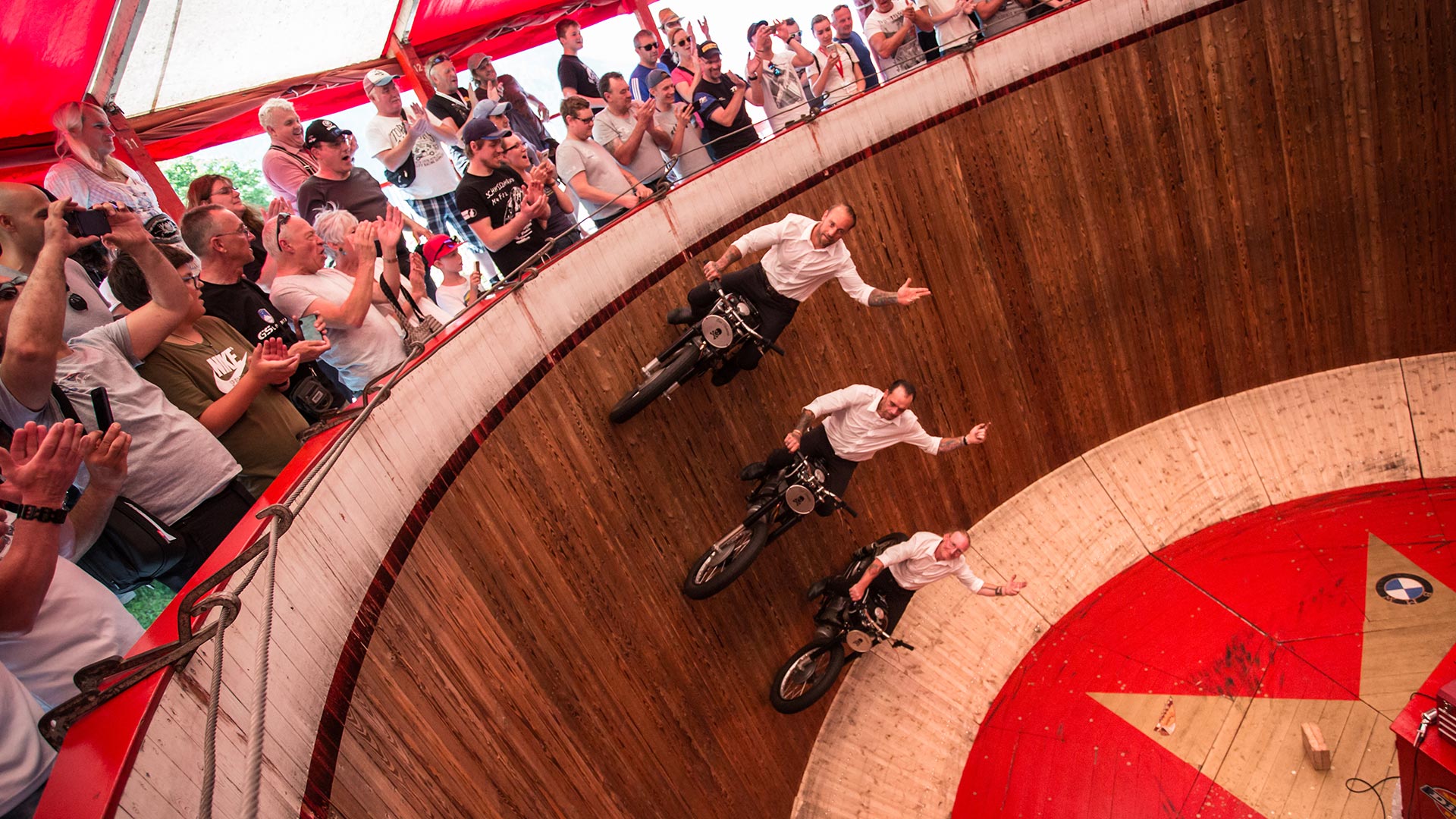 Immer ein Favorit der BMW Motorrad Days ist die Steilwandshow im Original Motodrom, welche die Fans jedes Mal wieder beeindruckt. Sie stehen Schlange, um dem Spektakel von Donald Ganslmeier und seinem Team beizuwohnen, die mit alten Indians, BMWs und sogar mit einem Vierrad die vertikalen Holzoberflächen der ältesten mobilen Steilwand der Welt befuhren. In diesem Jahr kamen sie so nah und hoch, dass das Weiß ihrer Augen erkennbar war, als sie zur Unterhaltung der Massen gegen die Schwerkraft ankämpften.