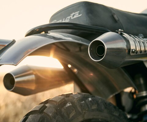 Auch im hinteren Teil modifizieren die Macher von Fuel Bespoke Motorcycles den Rahmen, montieren einen Heckbügel, um dem Motorrad einen klassischen Scrambler-Look zu geben. In diesen Look fügt sich passend die aus Natur- und Wildleder bezogene Sitzbank ein. Der Hollywood-Lenker, der kleine Scheinwerfer einer klassischen spanischen Enduro mit Gitterschutz und Schutzbleche aus Chrom verpassen dem Coyote einen unvergleichlichen Reiz. Krümmerrohre und Auspuff sind handgefertigt. Mini-LED-Blinker, Fußrasten von SW Motech und Zylinderkopfhauben im Retrolook von BMW Motorrad komplettieren die umgebaute R nineT Urban G/S. Die Customizer haben mit der einstellbaren hydraulischen Kartusche für die Vordergabel von Andreani und dem hinteren Stoßdämpfer von Öhlins (46 DRL BM 641) das Fahrwerk optimiert. Für den Einsatz auf der Straße und im Gelände entschied sich Karles für die Bereifung Continental TKC 80 – quasi die Allzweckwaffe für jeden Untergrund.