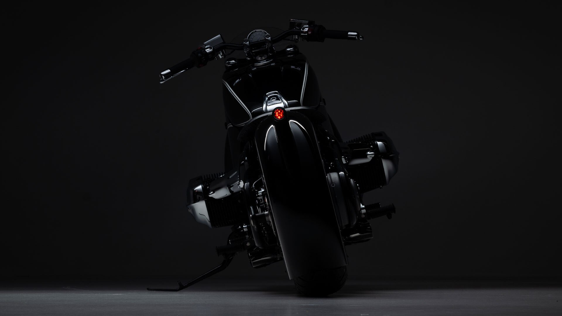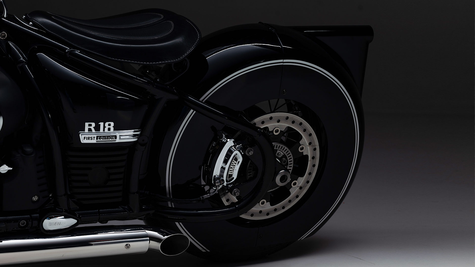 Mit gerade einmal 8 mm Luft schmiegt sich die Verkleidung an den Tank. Dessen klassische Farbgebung mit der ikonografischen Doppellinierung läuft somit quasi nahtlos auf dem imposanten handgefertigten Bauteil weiter. Natürlich ziert die Lackierung auch den hinteren Kotflügel, der sagenhafte 310 Grad abdeckt und so die Frontgestaltung perfekt aufgreift. Ein Scharnier-Mechanismus ermöglicht hier überhaupt erst den Radwechsel. Präzise gesetzte Öffnungen erlauben den Blick auf die Scheibenbremse und den Antrieb. Auch hier zeigt sich, was die Seele der Spirit of Passion ausmacht: Sie begegnet dem Entwurf der R 18 mit höchstem Respekt und wird dabei selbst zu einem wahren Meisterstück.